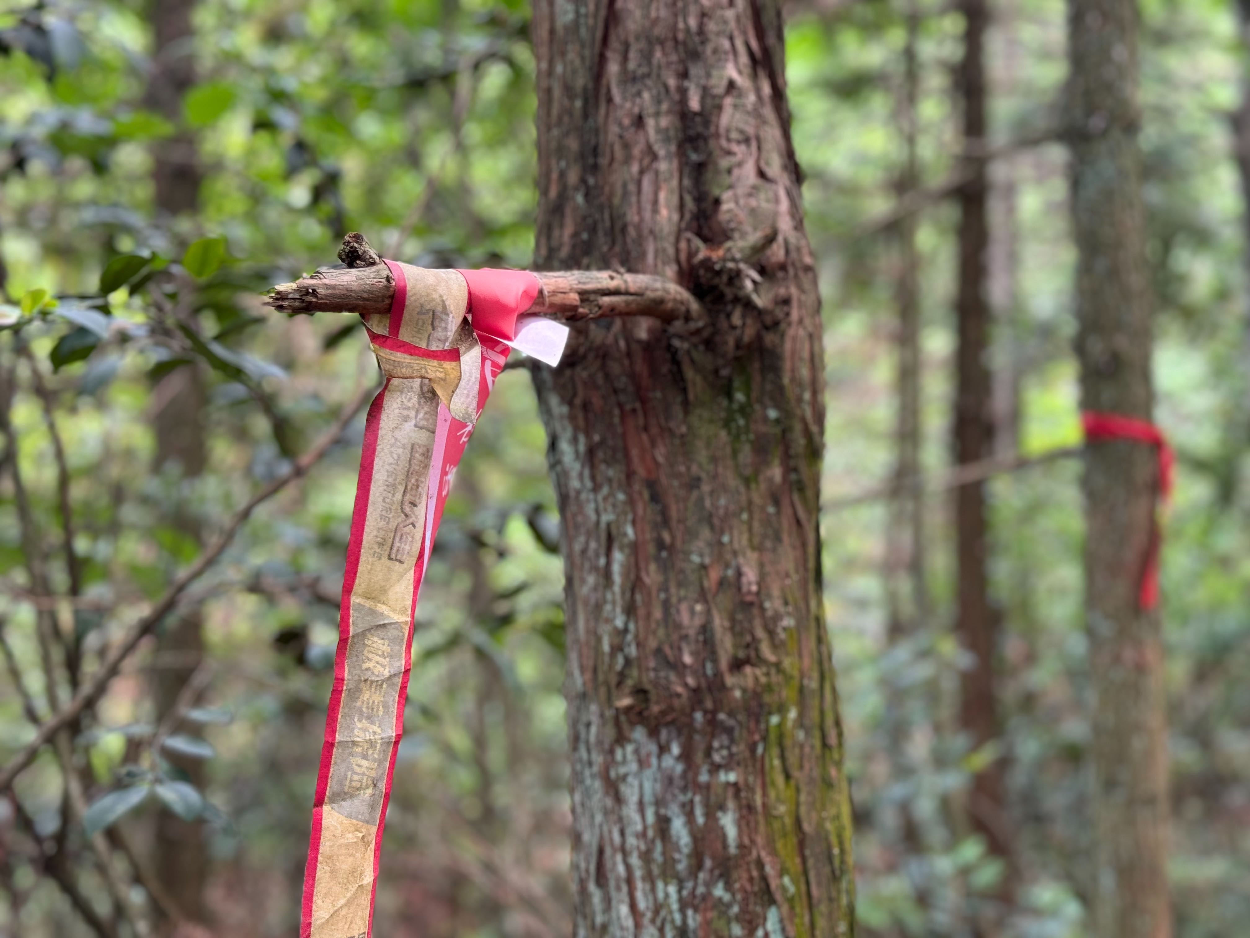 大约十年前,我开始接触徒步,走广州的火凤线,知道了户外会有通过飘带标记正确方向的做法。这次久违的徒步,有些路段和同伴拉开了距离,在小路上看到飘带时会感觉很安心。