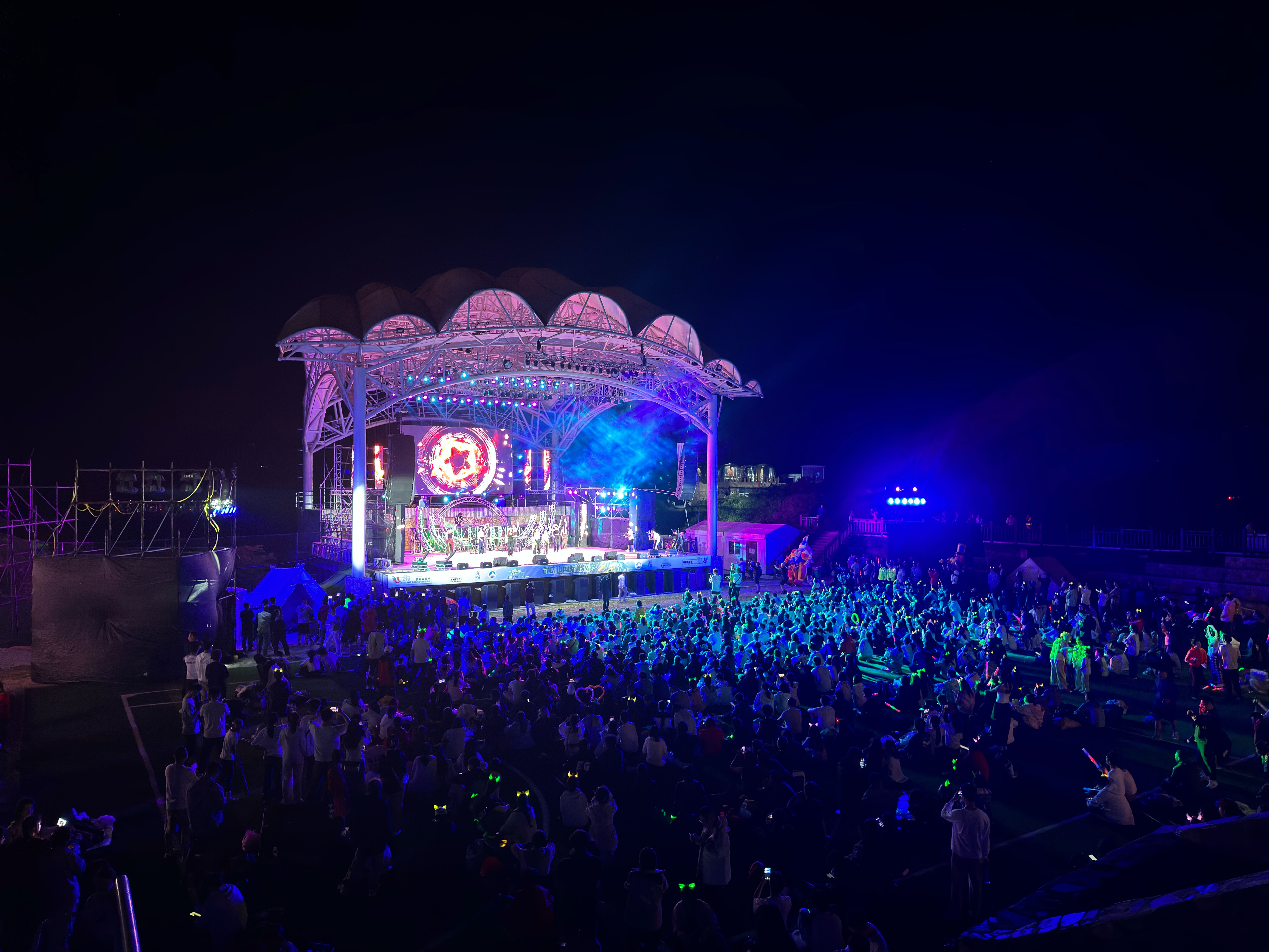 傍晚抵达露营地之后,正巧遇到了今年的武功山帐篷节,游人众多。队伍集合晚饭之后,领队带我们去领睡袋之类的,分帐篷住下。晚上入睡之前,我拿出为了这次徒步特意准备的自拍杆三脚架,延长快门时间、降低曝光。虽然当天晚上并不是大晴天,但我还是第一次用手机拍到了满天星星的照片。