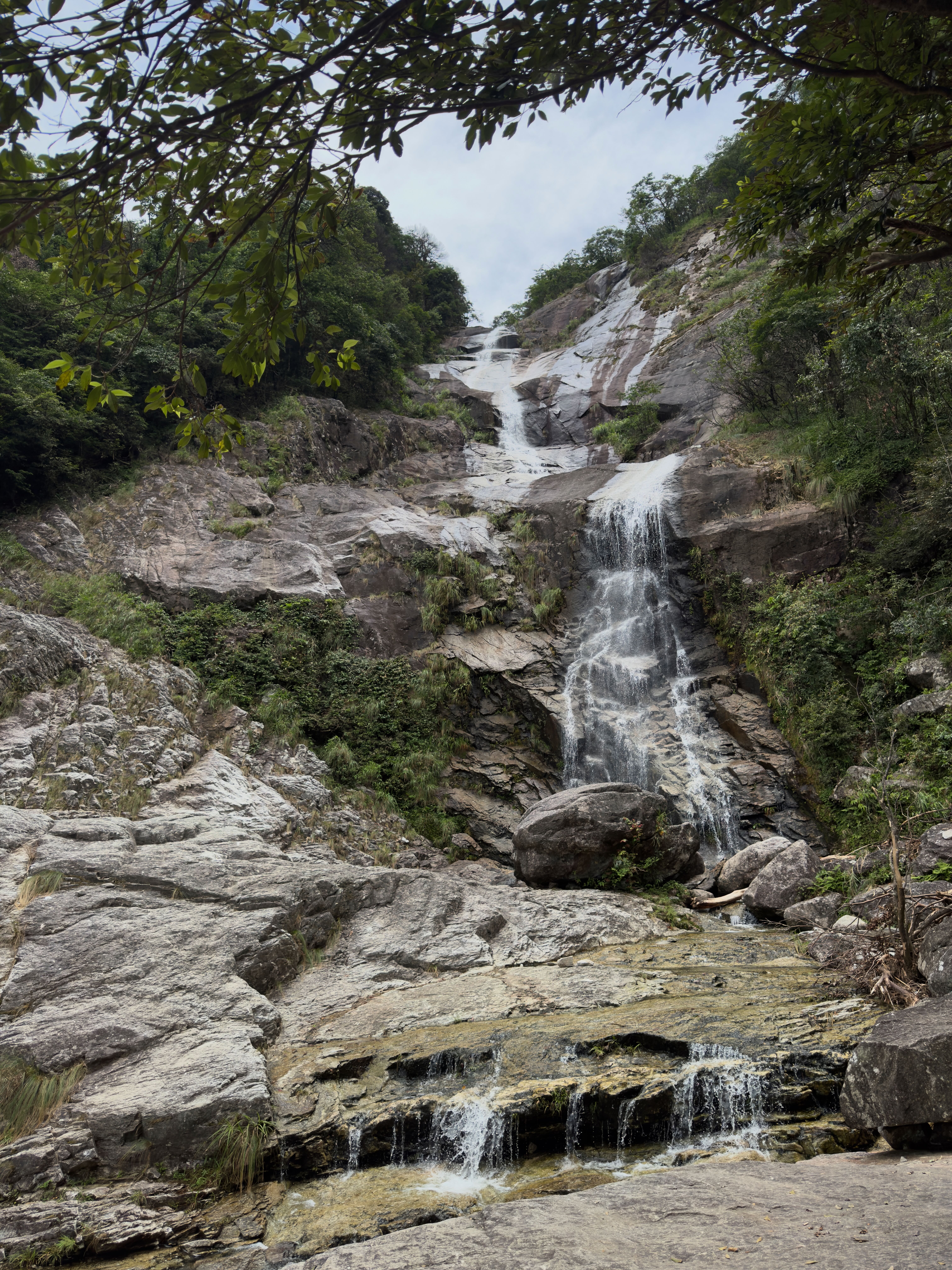 接近中午的时候,我们开始了下山的行程,而下山的这段路对我来说可能是整个徒步过程最有难度的一段。我们走的是山间的一条下坡小路,小路两旁是交错的树木与岩石,地面上布满了树根和松散的泥土,每一步都需要小心翼翼,以免滑倒或绊倒。很多时候,我都必须借助两根登山杖,才能找到下坡的支撑点,而有时候又需要手脚并用,抓住树根和岩石才能稳住身形。这一段路对我的体力和耐力都是极大的考验。虽然艰难,但这段路上也有着意外的惊喜。中间我们遇到了一处山间溪流汇聚成的小水潭,让我们可以在冰凉的清水中泡泡脚,缓解下山的疲劳。在下山的最后,我们还看到了沿途哗哗溪水最终汇成的瀑布。