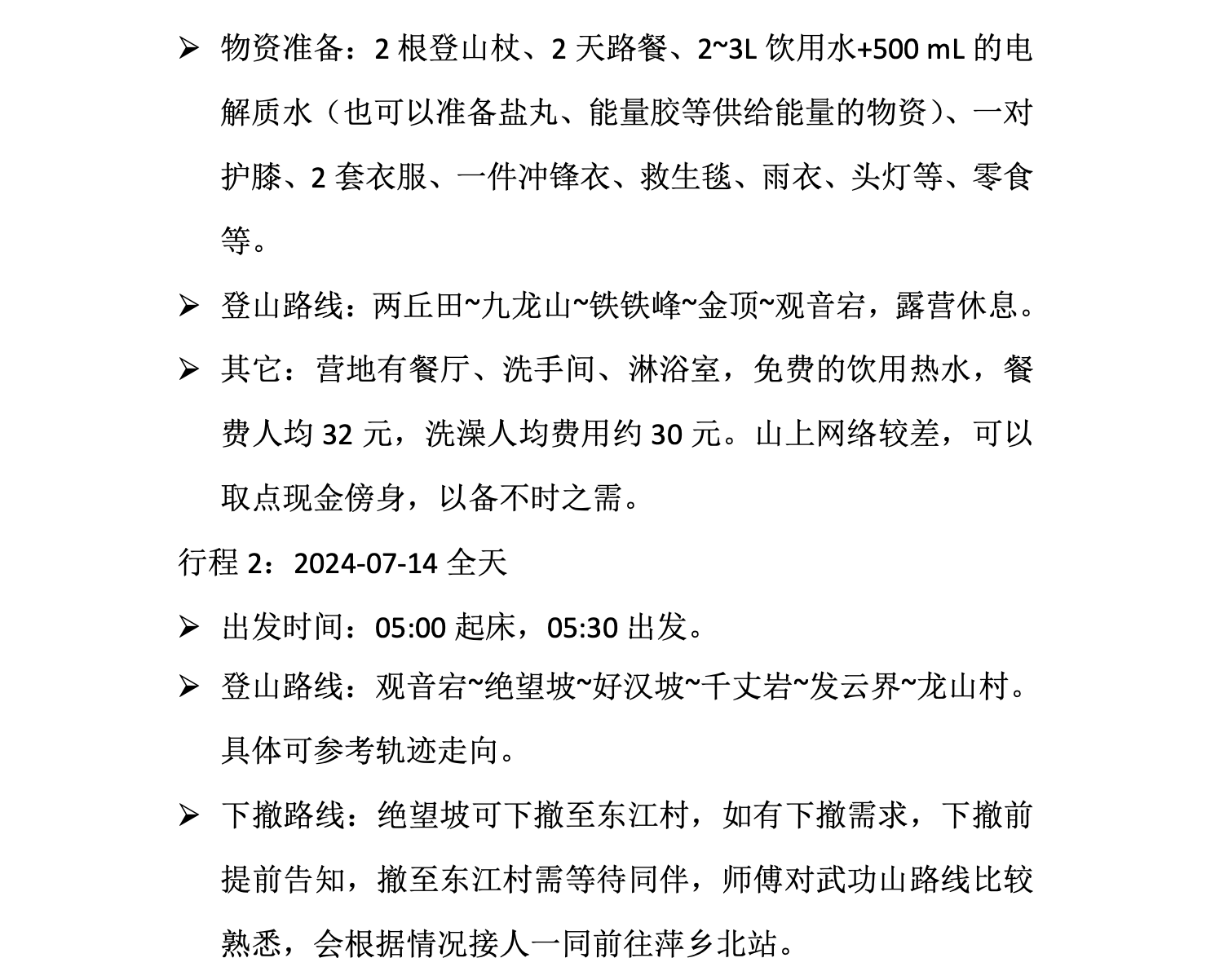- 个人用品:洗漱用品、一次性床上四件套(营地提供了帐篷、睡袋和防潮垫)、防晒喷雾、无比滴、花露水、急救包、急救毯、一次性雨衣、纸巾、湿巾、现金 100 元(山上很多时候我的联通没有信号,在一些补给点买水用的现金)、水杯。