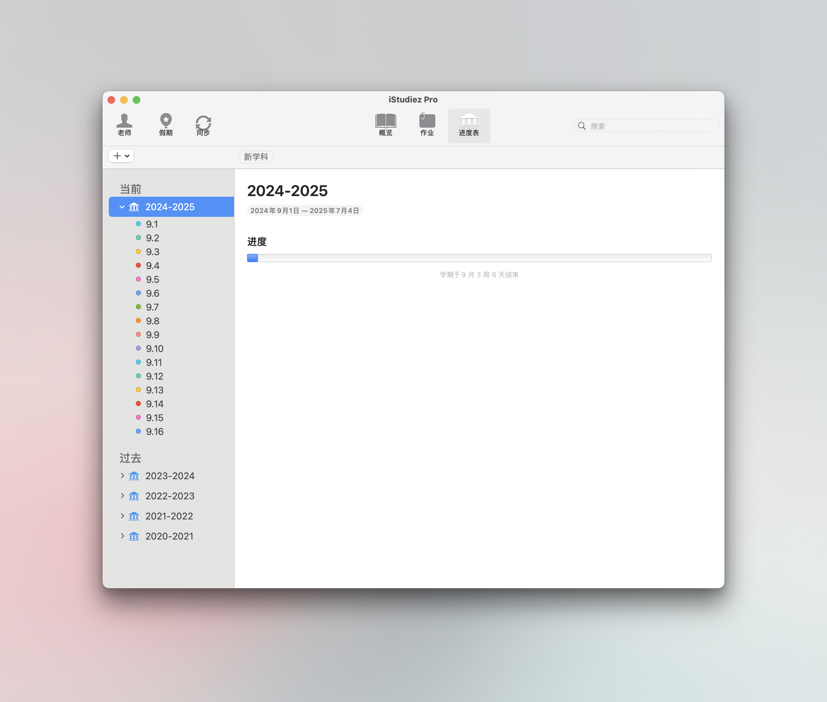 接着,就可以在“进度表”界面为每个科目添加课程信息。但我个人习惯在电脑端的“概览”界面,对照学校下发的课程表,一一记录我每节课的详细安排。