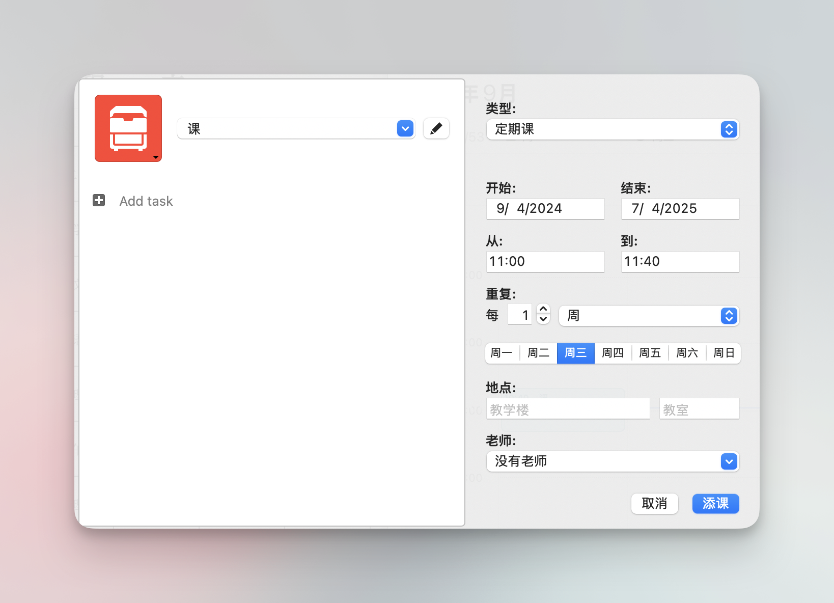 你可以选择定期课或单次课。像日常教学,我一般选择“定期课”,然后编辑每节课的开始结束日期、上课下课时间、重复频率、教室地点等具体信息。