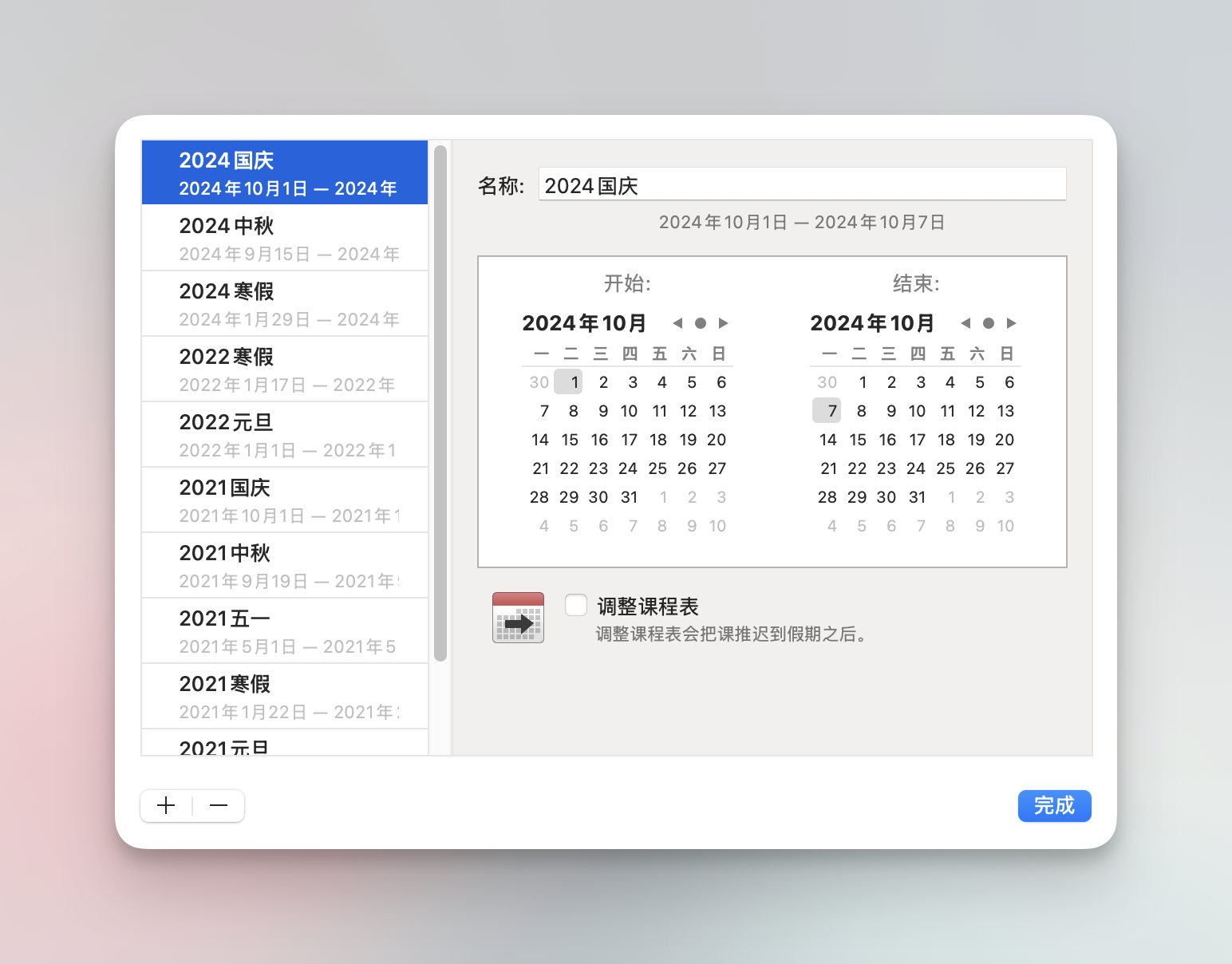 对于假期,在“进度表”界面的“假期”选项中可以根据实际情况添加。在设置中,对于假期中的课程可以有两种处理方式——“其他日期”模式下,假期中的课程将被取消,而“全部课程表”模式则会将课时顺延。