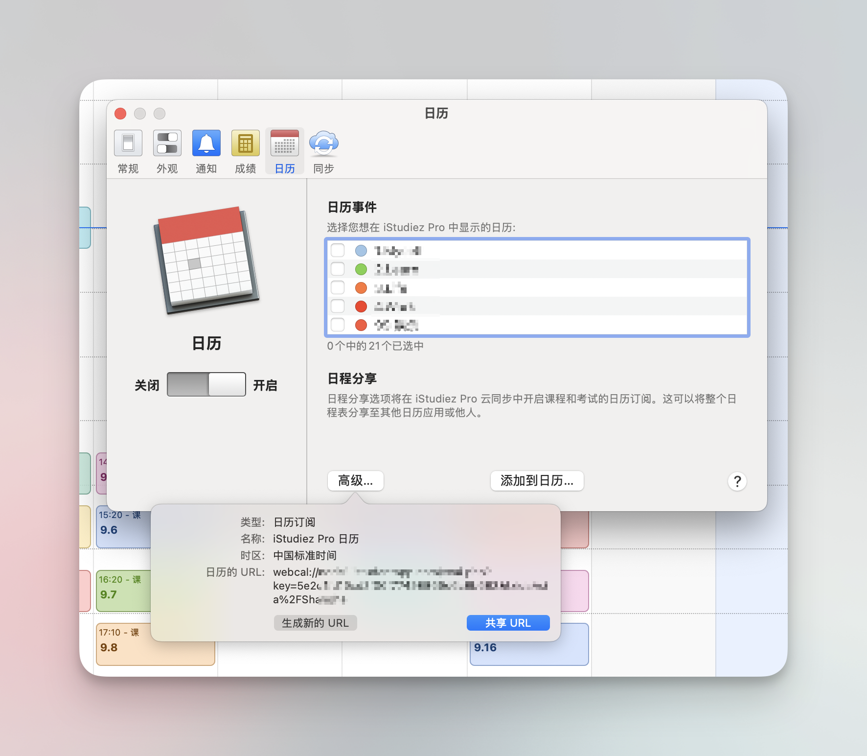 在“设置”-“日历”界面,点击“添加到日历”即可将课程表直接同步到苹果日历。如果你需要同步到 Google 日历或 Outlook 日历,还可以选择“高级”选项,获取 webcal 格式的日历 URL 进行订阅。
