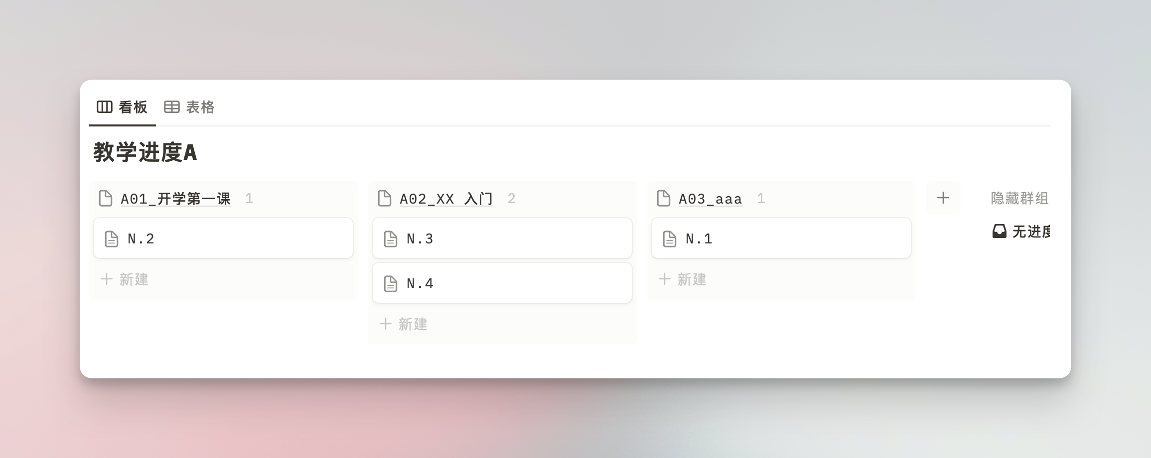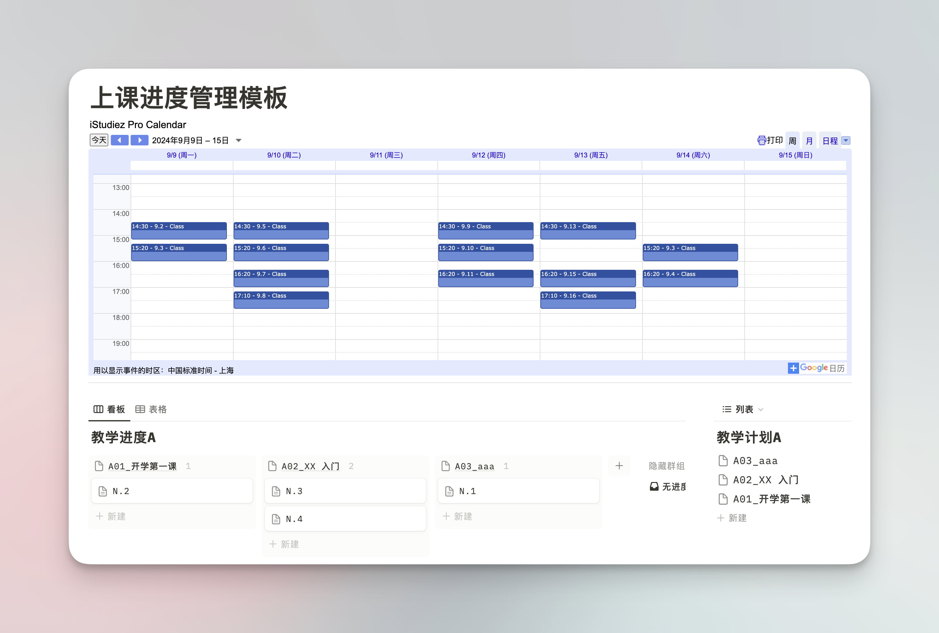 ”教学计划“表格包含不同班级的记录,打开后可查看该班级的详细课程进度。”教学计划“的”看板“界面,则可以直观看到整体的各个班级进度情况。
