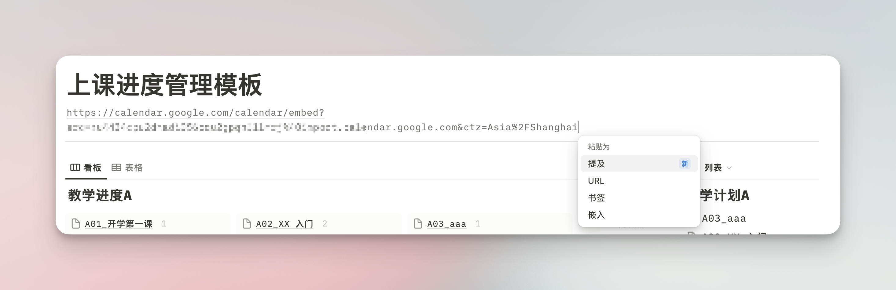 根据我之前 文章 的操作创建课表日历后,(以我使用的 Google 日历为例)可将课表信息嵌入到进度页面中。