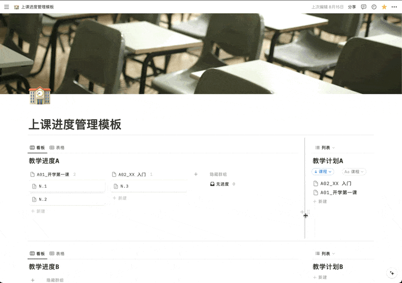 每个年级的进度跟踪模板包含两个表格:”教学进度“和”教学计划“。前者用于记录每节课的具体进度,后者用于制定并记录整体教学计划。模板默认设置了两个年级(A 和 B),接下来的说明以年级 A 为例。