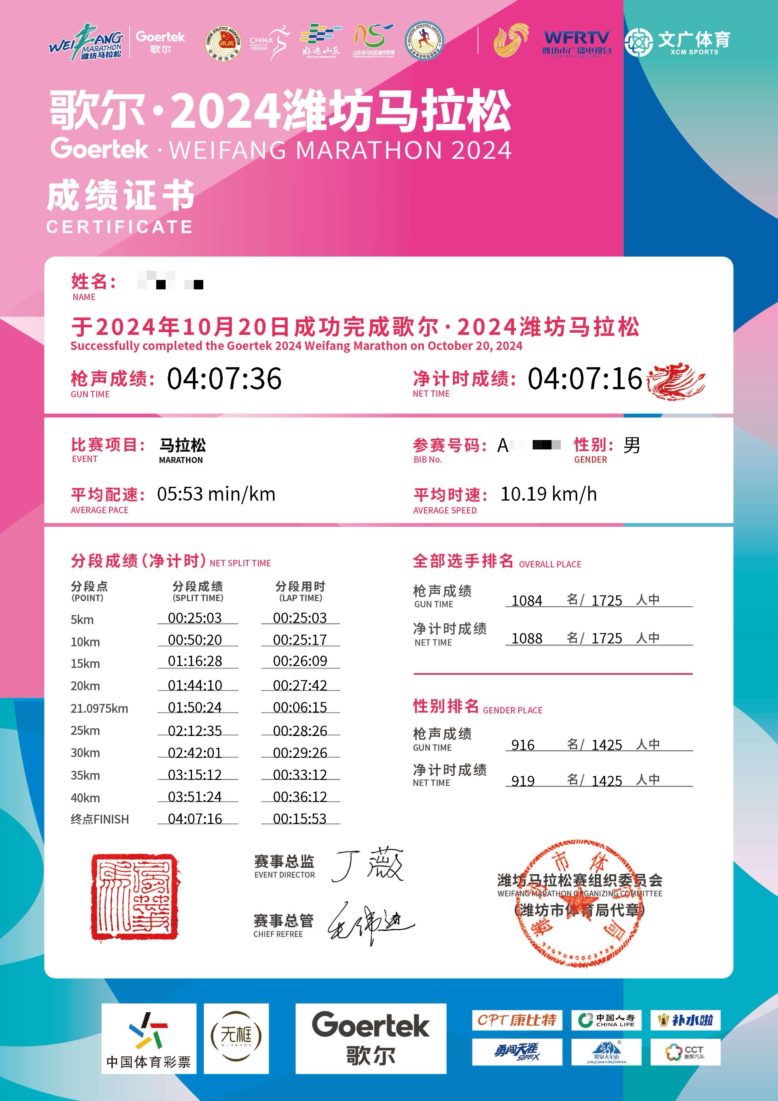 刚刚过去的周末,我参加了「2024 潍坊马拉松」,并以 4:07:16 的成绩完赛。这是我第三次参加全程马拉松。